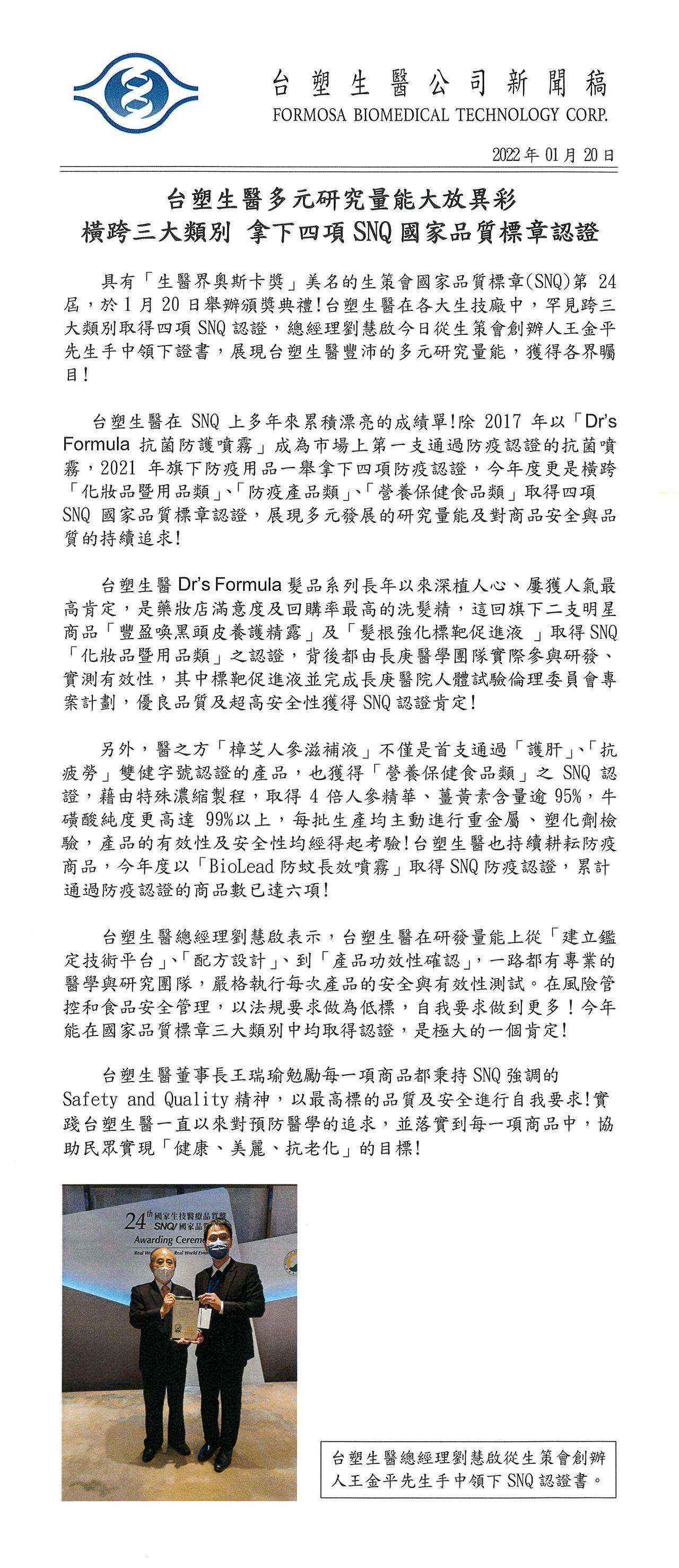 台塑生醫橫跨三大類別,取得四項SNQ認證,豐沛研究量能獲得各界矚目!